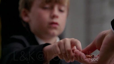Negoziante “Ragazzi, cosa avete lì? Apri la borsa. Dove l’hai preso questo?” Kate “L’ho preso li” Negoziante “Io ti conosco. Sei la figlia di Diane Austen. Come ti chiami?” Kate “Katie” Negoziante “Katie, chiamerò tua madre e poi la polizia, perché non tollero i furti qui. Hai capito?” Jacob “Non ce ne è bisogno. Lo pago io quello. Spero che questi bastino” Negoziante “Beh, finchè qualcuno lo paga, non c’è stato alcun danno. Ma non ti voglio più rivedere qui senza i tuoi genitori, hai capito?” Kate “Grazie, signore” Jacob “Prego. Non ruberai più, vero? Fai la brava, Katie”. Jacob le tocca il naso. (5.16 – 5.17 – L’incidente – The Incident, parts 1 & 2)